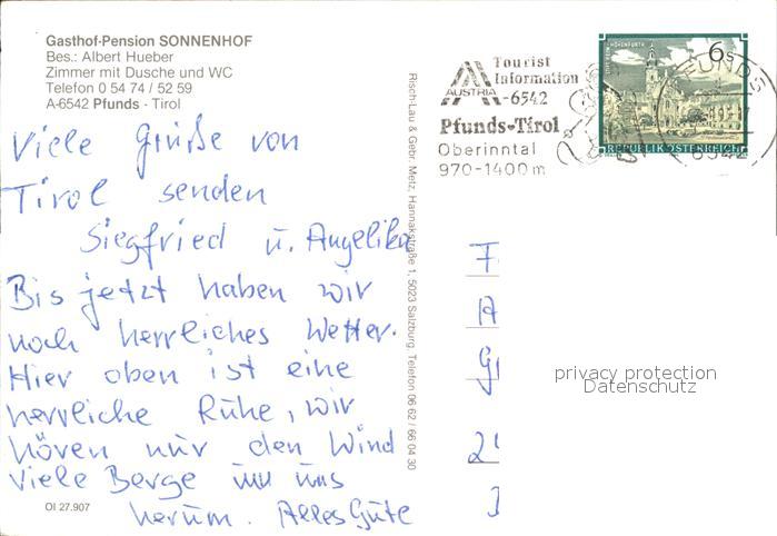 11923325 alte Postkarte Pfunds Gasthof Pension Sonnenhof Stube Panorama postalisch gelaufen Erhaltung siehe scans KatCode: 11390334070617