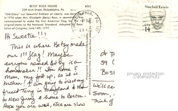 73130491 old postcard Philadelphia New York Betsy Ross House postalisch gelaufen Erhaltung siehe scans [KathaD81] KatCode: 14140340000000