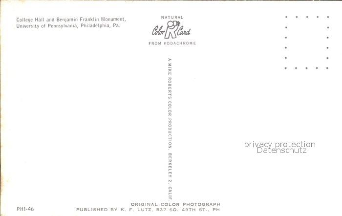 72349004 Philadelphia Pennsylvania College Hall and Benjamin Franklin Monument postalisch nicht gelaufen Erhaltung siehe scans KatCode: 14140410000000