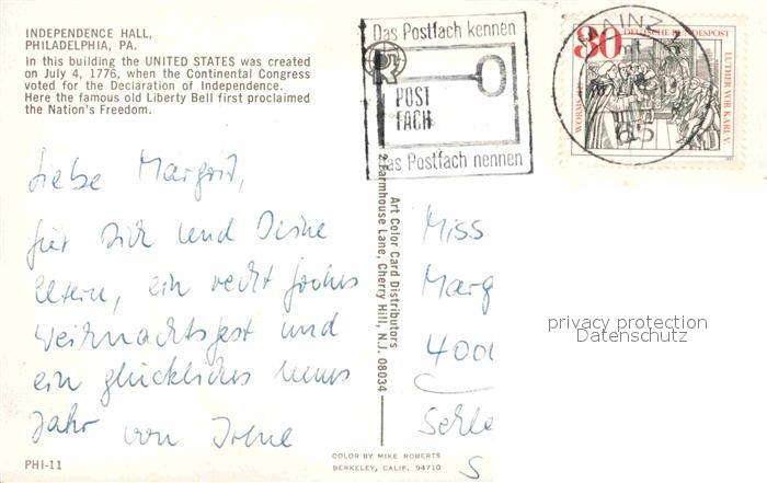 72753333 old postcard Philadelphia Pennsylvania Independence Hall postalisch gelaufen Erhaltung siehe scans [NatalD47] KatCode: 14140410000000
