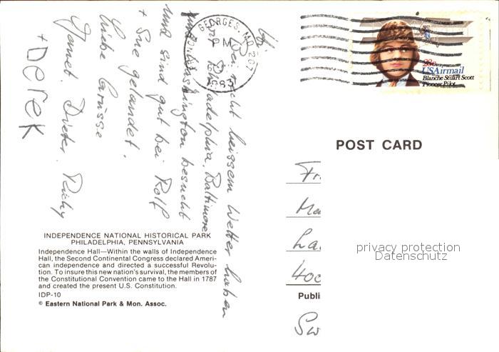 72512436 old postcard Philadelphia Pennsylvania Independence Hall postalisch gelaufen Erhaltung siehe scans KatCode: 14140410000000