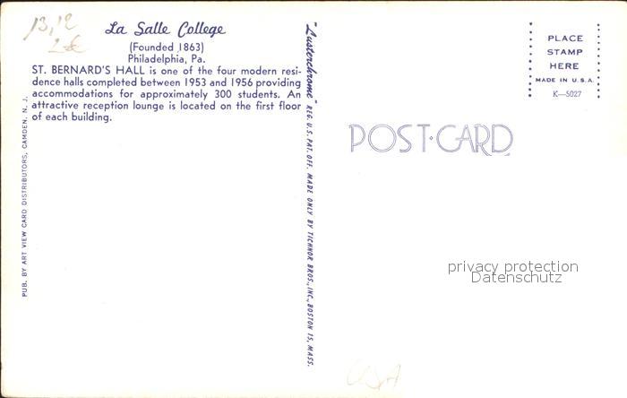71951060 Philadelphia Pennsylvania La Salle College St Bernards Hall postalisch nicht gelaufen Erhaltung siehe scans KatCode: 14140410000000