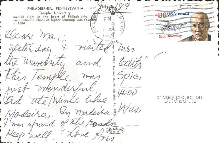 72219328 old postcard Philadelphia Pennsylvania Temple University postalisch gelaufen Erhaltung siehe scans KatCode: 14140410000000