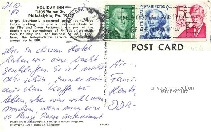 74091315 old postcard PHILADELPHIA Pennsylvania USA Holiday Inn Walnut St. postalisch gelaufen Erhaltung siehe scans [IrynaD87] KatCode: 14140410000000