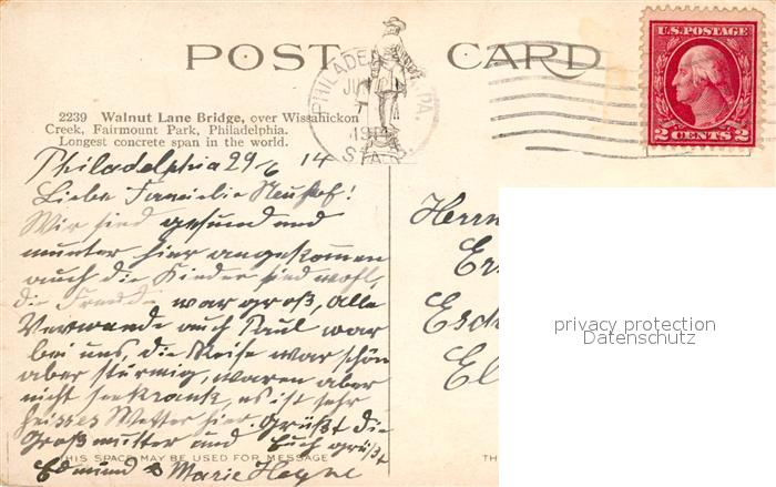 43099711 old postcard Philadelphia Pennsylvania Walnut Lane Bridge over the Wissahickon postalisch gelaufen Erhaltung siehe scans [FriedD77] KatCode: 14140410000000