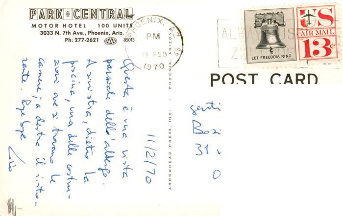 73904703 old postcard Phoenix Arizona Motor Hotel Park Central Swimming Pool postalisch gelaufen Erhaltung siehe scans [FriedD77] KatCode: 14140030000000