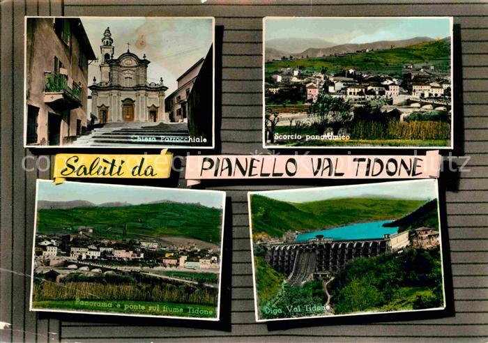 old postcard Pianello Val Tidone Chiesa Scorcio panoramico Ponte Diga postalisch gelaufen Erhaltung siehe scans [FriedD77]