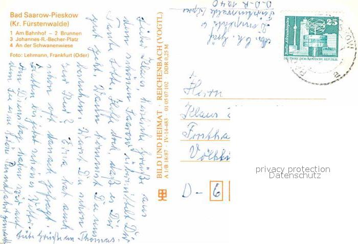 72882034 alte Postkarte Pieskow Bad Saarow Bahnhof Brunnen Johannes Becher Platz Schwanenwiese postalisch gelaufen Erhaltung siehe scans [FriedD77] KatCode: 11110012067024