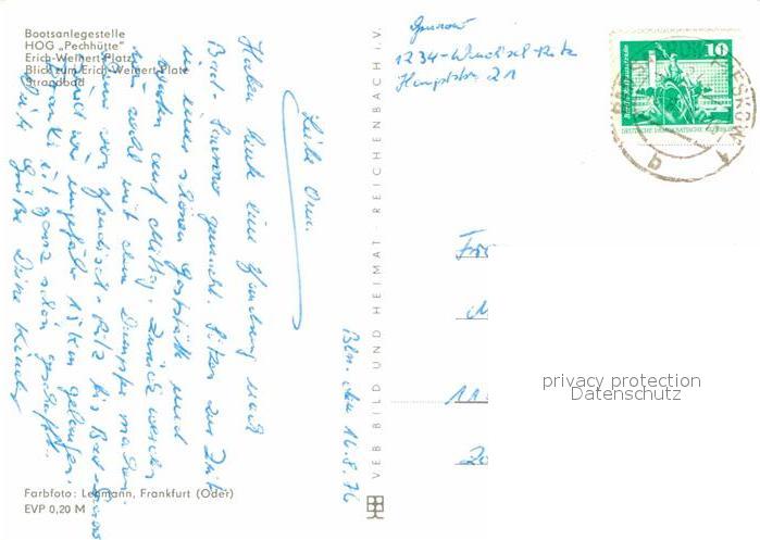 72918575 alte Postkarte Pieskow Bad Saarow Bootsanlegestelle HOG Pechhuette Erich Weinert Platz Strandbad postalisch gelaufen Erhaltung siehe scans [FriedD77] KatCode: 11110012067024