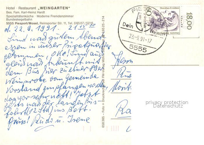 73649049 alte Postkarte Piesport Hotel Restaurant Weingarten Panorama Moseltal postalisch gelaufen Erhaltung siehe scans [FriedD77] KatCode: 11110007231105