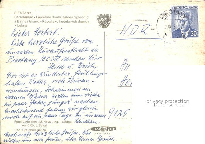 old postcard Piestany Barlolamac Liecebne domy Balnea Splendid a Balnea Grand Kupalisko liecebnych domov Lekna postalisch gelaufen Erhaltung siehe scans