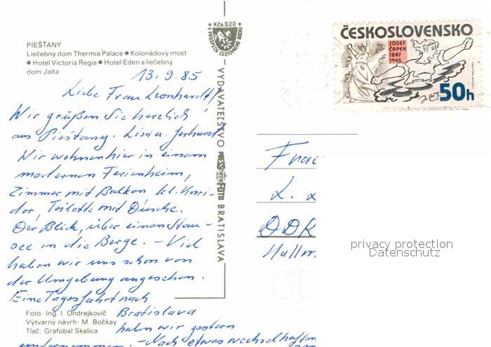 old postcard Piestany Hotel-Victoria-Regia Hotel-Edna Brueckenpartie postalisch gelaufen Erhaltung siehe scans [LiesaD40]