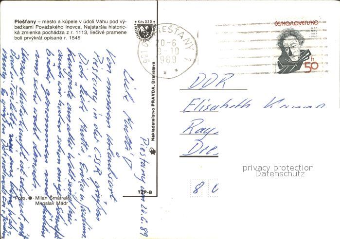 old postcard Piestany Mesto kupele udoli Vahu pod vybezkami Povazskeho Inovca postalisch gelaufen Erhaltung siehe scans