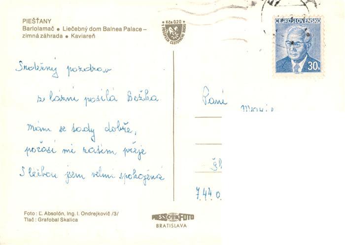 old postcard Piestany Pistian Poestyen SK Barlolamac Liecebny dom Balnea Palace zimna zahrada Kaviaren postalisch gelaufen Erhaltung siehe scans [WerneD78]