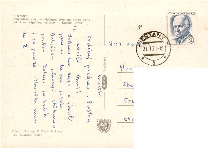 old postcard Piestany Pistian Poestyen SK Kolonadovy most Moderna stvrt na brehu Vahu Lekna na kupelnom ostrove Kupele Irma postalisch gelaufen Erhaltung siehe scans [WerneD78]