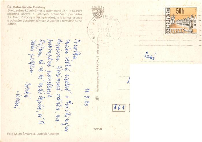 old postcard Piestany Pistian Poestyen SK Teilansichten Kolonnadenbruecke Park Seerosen postalisch gelaufen Erhaltung siehe scans [FriedD77]