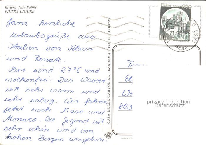 old postcard Pietra Ligure Strand Kirche Baumbluete Riviera delle Palme postalisch gelaufen Erhaltung siehe scans