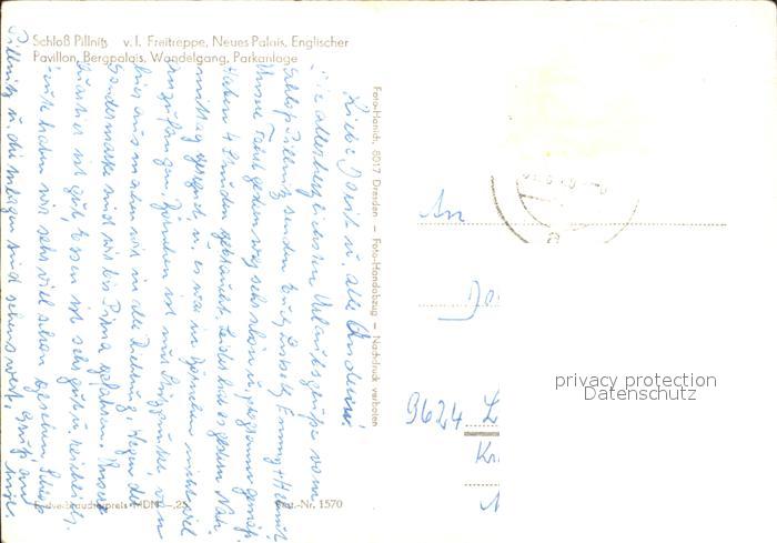 72332066 alte Postkarte Pillnitz Schloss Freitreppe Palais Englischer Pavillon Wandelgang Park postalisch gelaufen Erhaltung siehe scans KatCode: 11110014262000