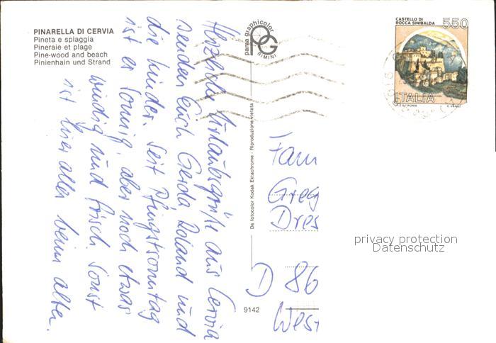 old postcard Pinarella di Cervia Pinienhain Strand postalisch gelaufen Erhaltung siehe scans