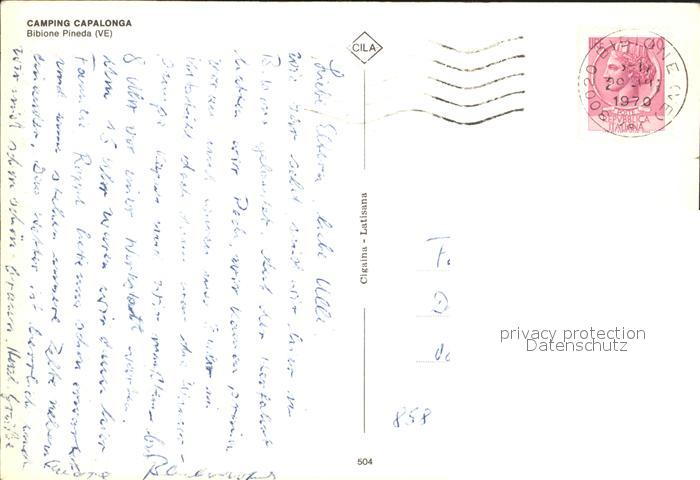 old postcard Pineda Bibione Camping Capalonga Strand Fischerboot Sonnenuntergang postalisch gelaufen Erhaltung siehe scans