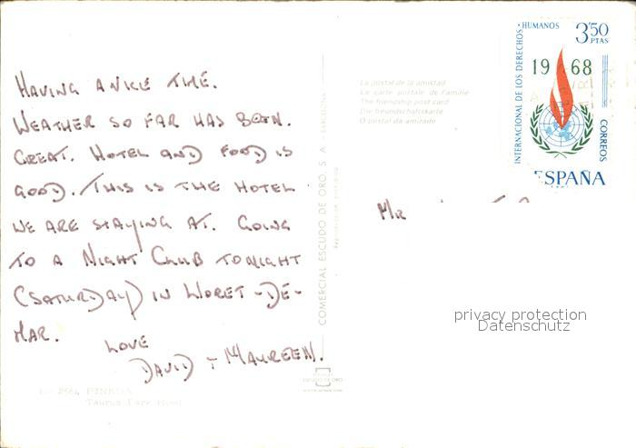 old postcard Pineda de Mar Taurus Park Hotel Strand postalisch gelaufen Erhaltung siehe scans