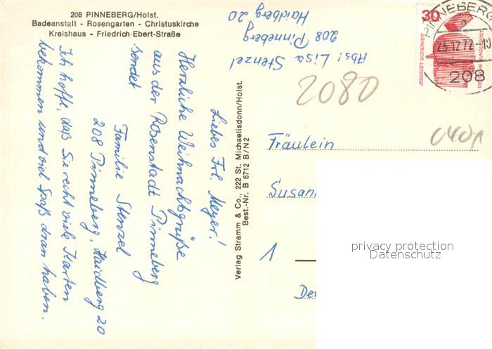 73731368 alte Postkarte Pinneberg Badeanstalt Rosengarten Christuskirche Kreishaus Friedrich Ebert Strasse postalisch gelaufen Erhaltung siehe scans [FriedD77] KatCode: 11110001056039