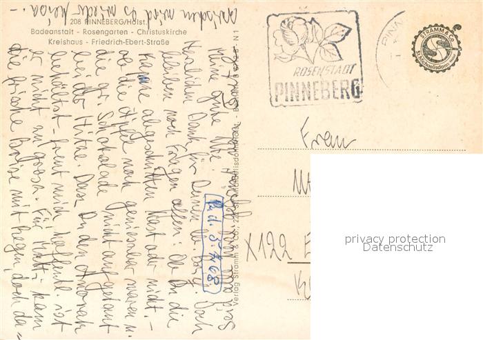 73670155 alte Postkarte Pinneberg Freibad Rosengarten Christuskirche Kreishaus Friedrich Ebert Strasse postalisch gelaufen Erhaltung siehe scans [WerneD78] KatCode: 11110001056039