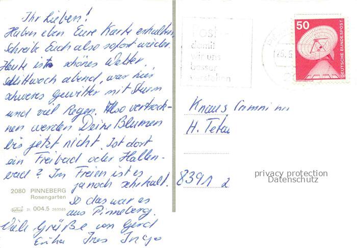 74156717 alte Postkarte Pinneberg Schleswig-Holstein Rosengarten Pergola Rosen Frau Kind Spaziergang Baeume postalisch gelaufen Erhaltung siehe scans [Karloger] KatCode: 11110001056039