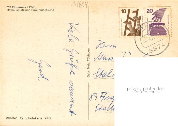 73615556 alte Postkarte Pirmasens Rathausplatz und Pirminius Kirche postalisch gelaufen Erhaltung siehe scans [WerneD78] KatCode: 11110007317000