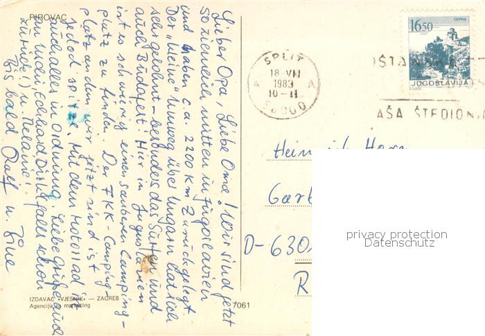 73769699 Pirovac Croatia Kuestenort postalisch gelaufen Fliegeraufnahme Erhaltung siehe scans [FriedD77] Fliegeraufnahme old postcard Frie Katcode 11260