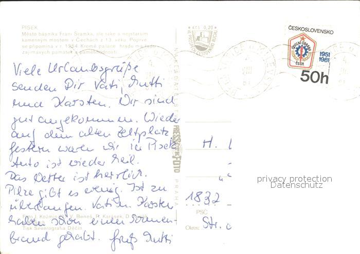 old postcard Pisek Tschechien Mesto basnika Frani Sramka Poprve se pripomina Krome palace postalisch gelaufen Erhaltung siehe scans