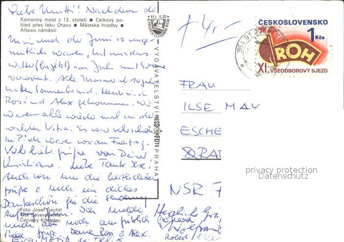 old postcard Pisek Tschechien Steinbruecke Fluss Otava Stadtmauer Platz postalisch gelaufen Erhaltung siehe scans