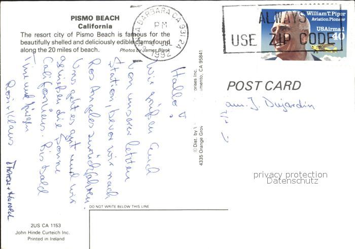 72486726 old postcard Pismo Beach Seebruecke Strand Pelikan postalisch gelaufen Erhaltung siehe scans KatCode: 14140050000000