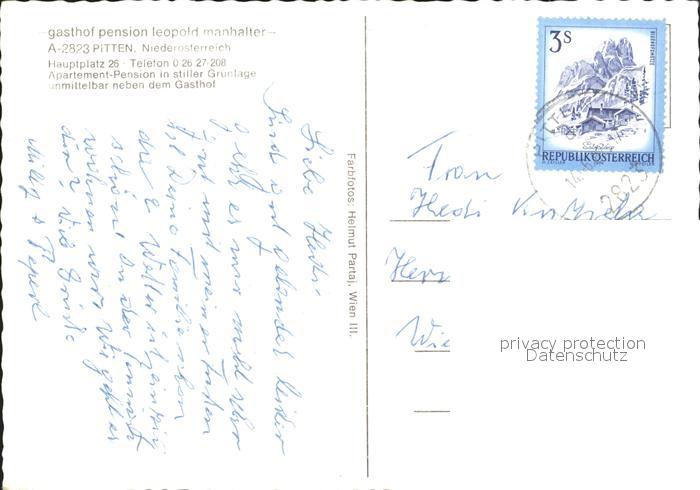 72128292 alte Postkarte Pitten Gasthof Pension Manhalter Gaststube Speiseraum postalisch gelaufen Erhaltung siehe scans KatCode: 11390122031823