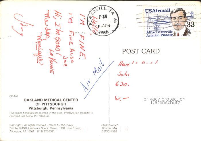 72481014 old postcard Pittsburg Pennsylvania Oakland Medical Center Fliegeraufnahme postalisch gelaufen Erhaltung siehe scans KatCode: 14140