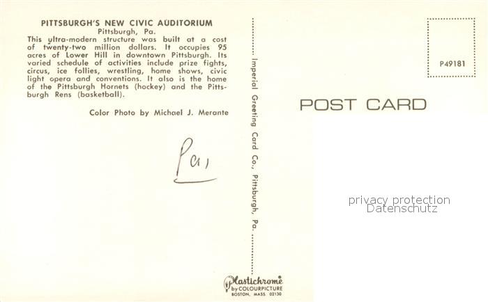 73645833 Pittsburgh New Civic Auditorium Fliegeraufnahme postalisch nicht gelaufen Erhaltung siehe scans [WerneD78] KatCode: 14140410000000
