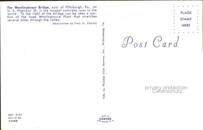 72091560 Pittsburgh Westinghouse Bridge postalisch nicht gelaufen Erhaltung siehe scans KatCode: 14140410000000