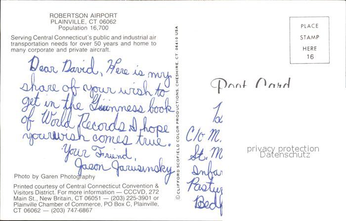 72273568 Plainville Connecticut Robertson Airport Fliegeraufnahme postalisch nicht gelaufen Erhaltung siehe scans KatCode: 14140070000000