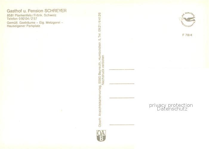 73708447 Plankenfels Gaststaette Pension Schreyer Landschaftspanorama Fraenkische Schweiz Felsen postalisch nicht gelaufen Erhaltung siehe scans [FriedD77] KatCode: 11110009472176
