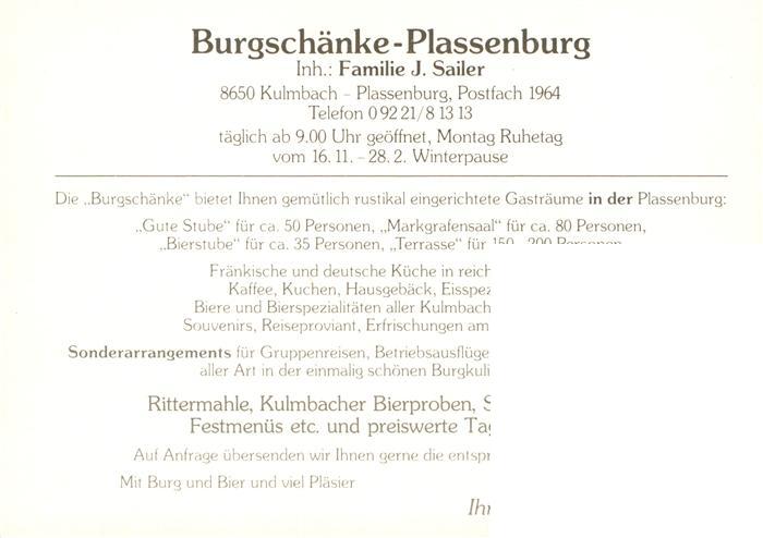 73941960 Plassenburg Kulmbach Burgschaenke Plassenburg Bierstube Markgrafen Saal Gute Stube postalisch nicht gelaufen Werbekarte (keine Postkarte) Erhaltung siehe scans [FriedD77] KatCode: 11110009477128