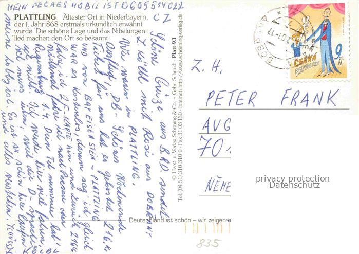 74152756 alte Postkarte Plattling Isar Bayern Kirche Stadtplatz Maibaum Fussgaengerzone Stadtpark postalisch gelaufen Erhaltung siehe scans [WerneD78] KatCode: 11110009271146