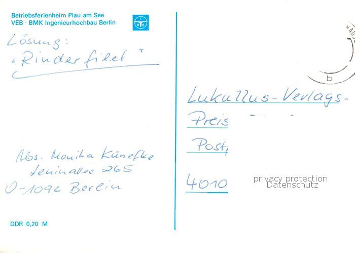 73017884 alte Postkarte Plau See Betriebsferienheim VEB Berlin postalisch gelaufen Erhaltung siehe scans [WerneD78] KatCode: 11110013060061