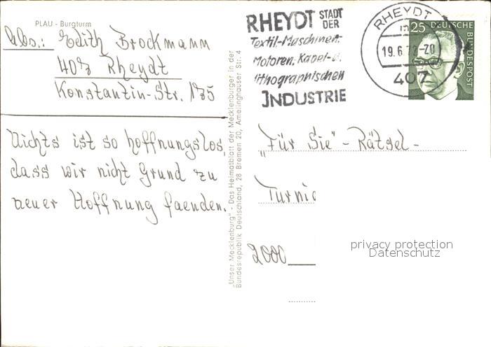 72063650 alte Postkarte Plau See Burgturm postalisch gelaufen Erhaltung siehe scans KatCode: 11110013060061