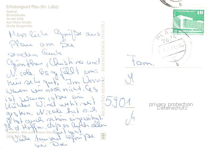 72972746 alte Postkarte Plau See Seelust Strandstrasse Elde Karl Marx Strasse Grosse Burgstrasse postalisch gelaufen Erhaltung siehe scans [FriedD77] KatCode: 11110013060061