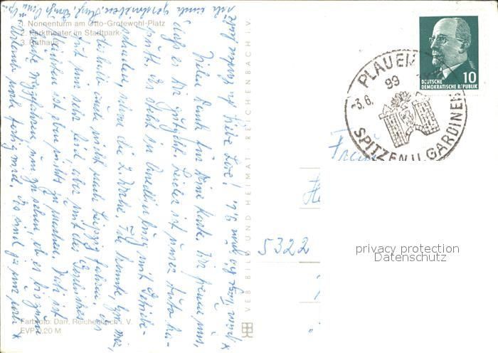 72035447 alte Postkarte Plauen Vogtland Nonnenturm Otto Grotewohl Platz Parktheater Stadtpark Rathaus postalisch gelaufen Erhaltung siehe scans KatCode: 11110014166000