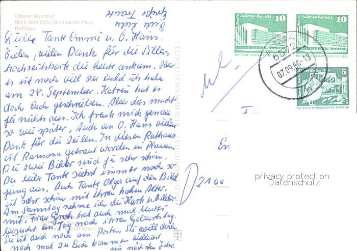 72455787 alte Postkarte Plauen Vogtland Oberer Bahnhof Otto Grotewohl Platz Rathaus postalisch gelaufen Erhaltung siehe scans KatCode: 11110014166000