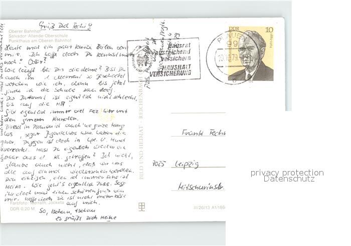 72078681 alte Postkarte Plauen Vogtland Oberer Bahnhof Salvador Allende Oberschule Punkthaus postalisch gelaufen Erhaltung siehe scans KatCode: 11110014166000