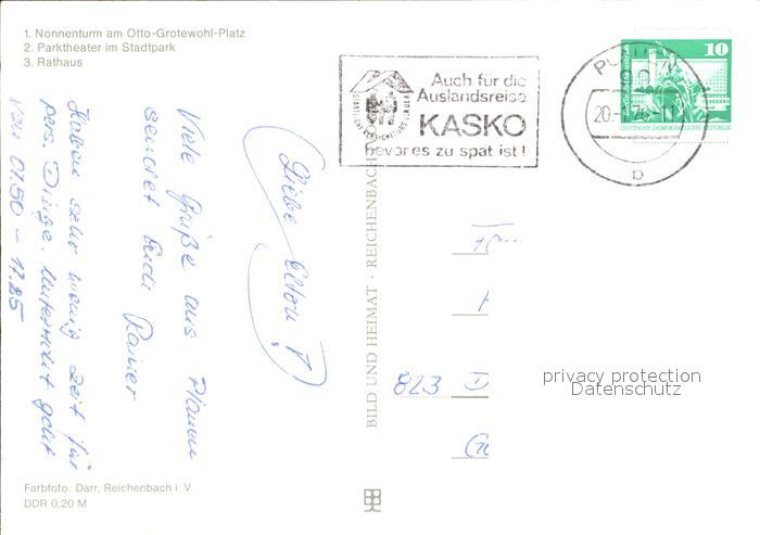 72409645 alte Postkarte Plauen Vogtland Parktheater Stadtpark Nonnenturm postalisch gelaufen Erhaltung siehe scans KatCode: 11110014166000