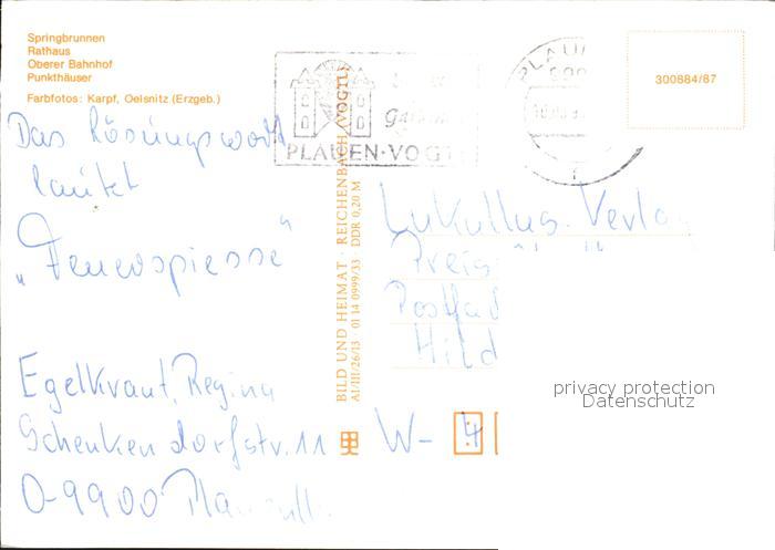72529203 alte Postkarte Plauen Vogtland Springbrunnen Rathaus Oberer Bahnhof Punkthaeuser postalisch gelaufen Erhaltung siehe scans KatCode: 11110014166000