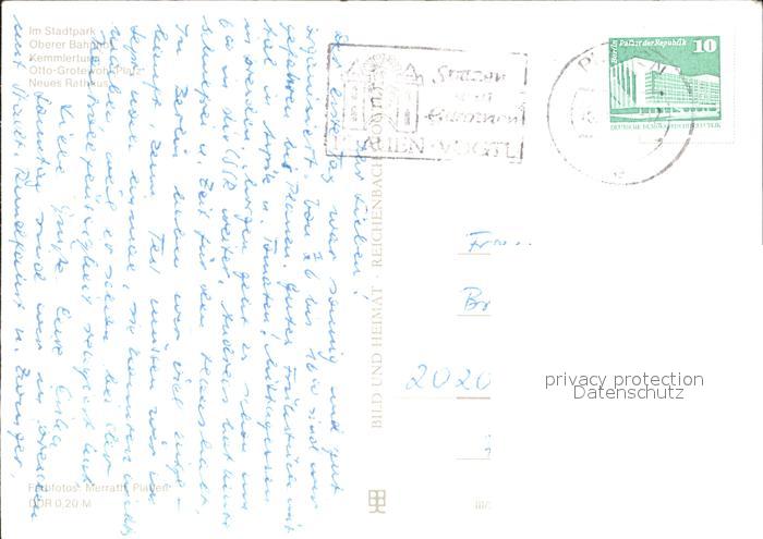 72374256 alte Postkarte Plauen Vogtland Stadtpark Bahnhof Kemmlerturm Otto Grotewohl Platz Rathaus postalisch gelaufen Erhaltung siehe scans KatCode: 11110014166000